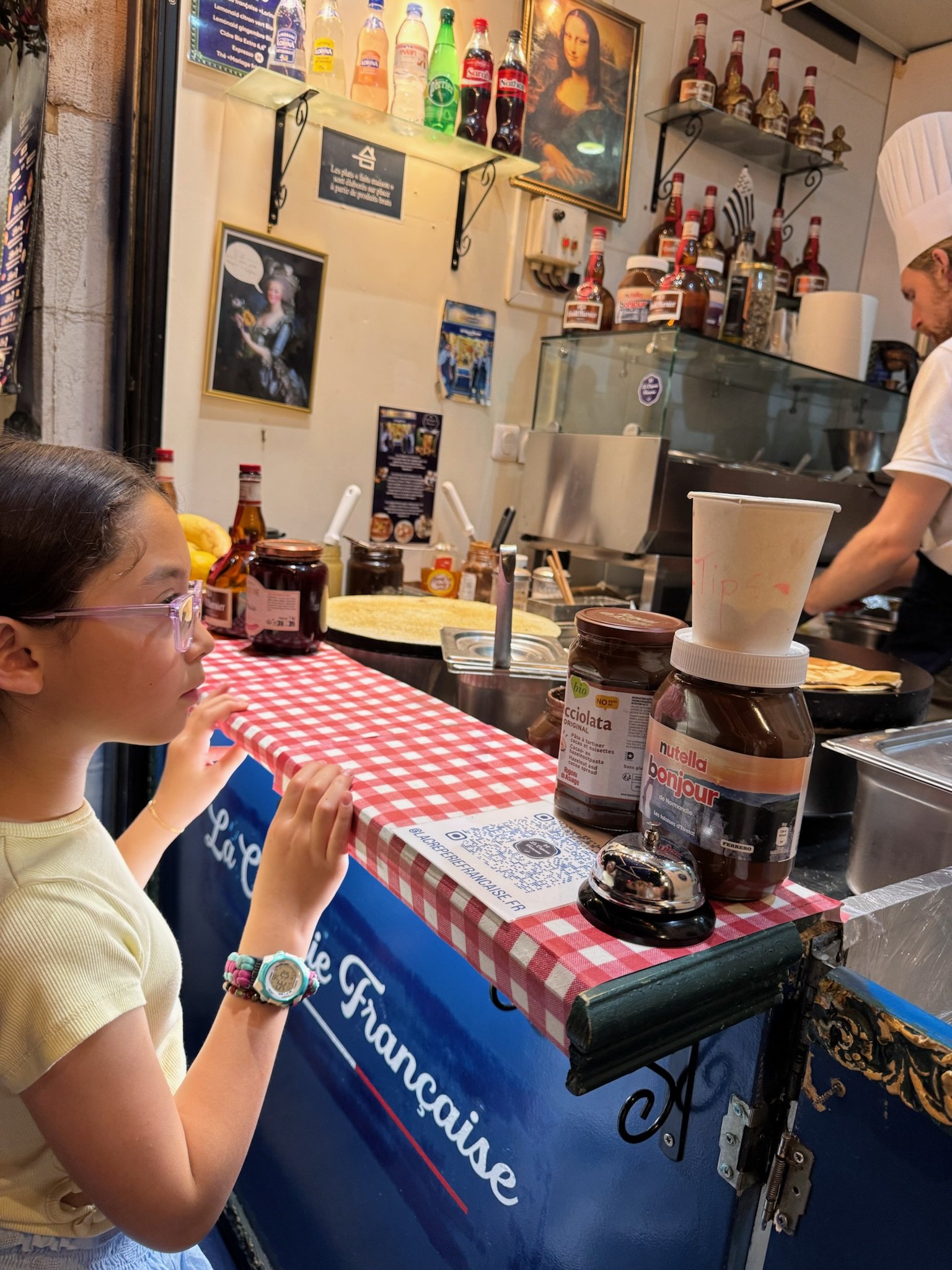 Watching French crepe making. We had a brown sugar one and a strawberry nutella one. I liked them both equally.