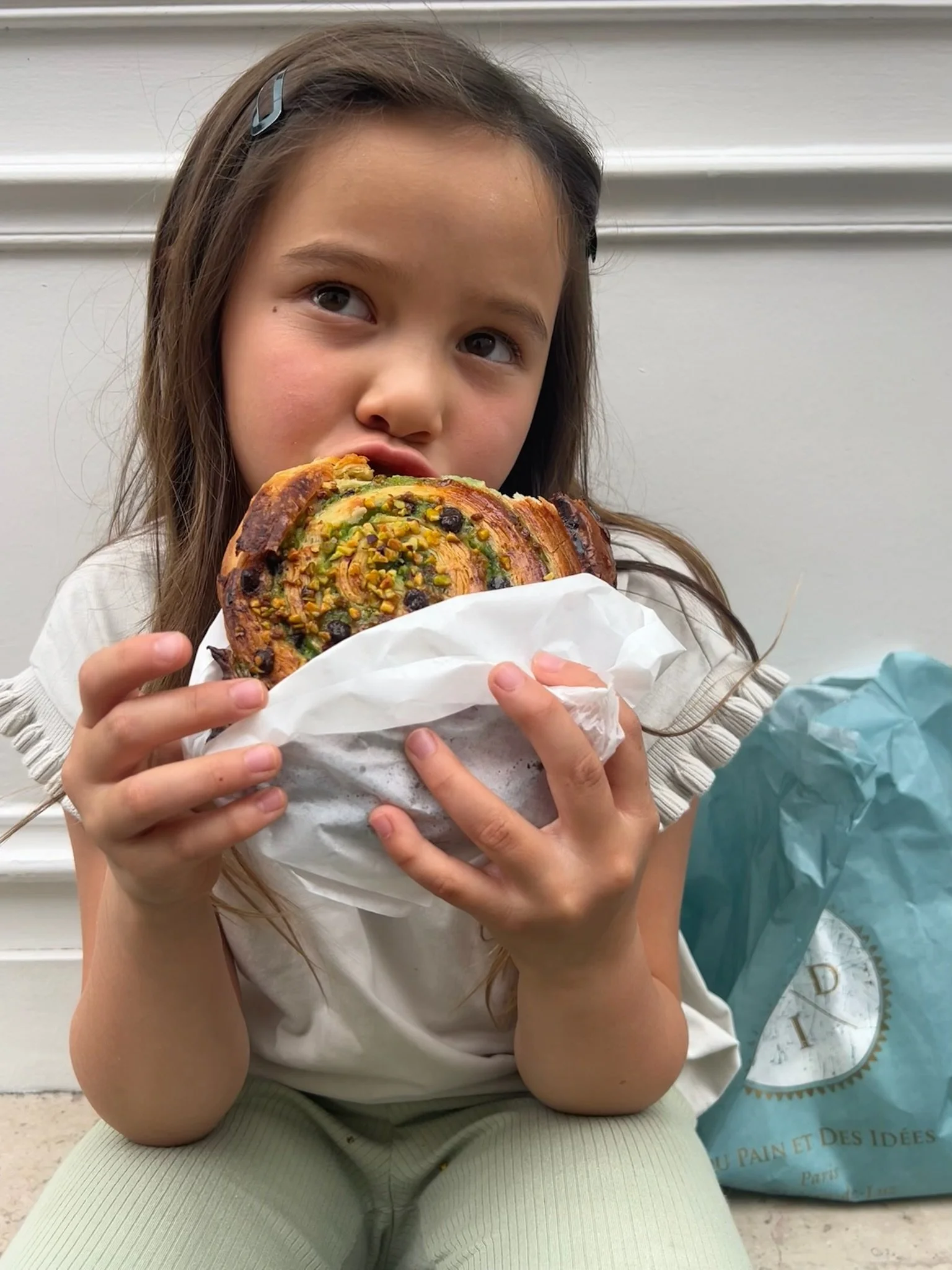 Saylor eating an escargot. No, it doesn’t have snails, but it is spiral and has pistachio.