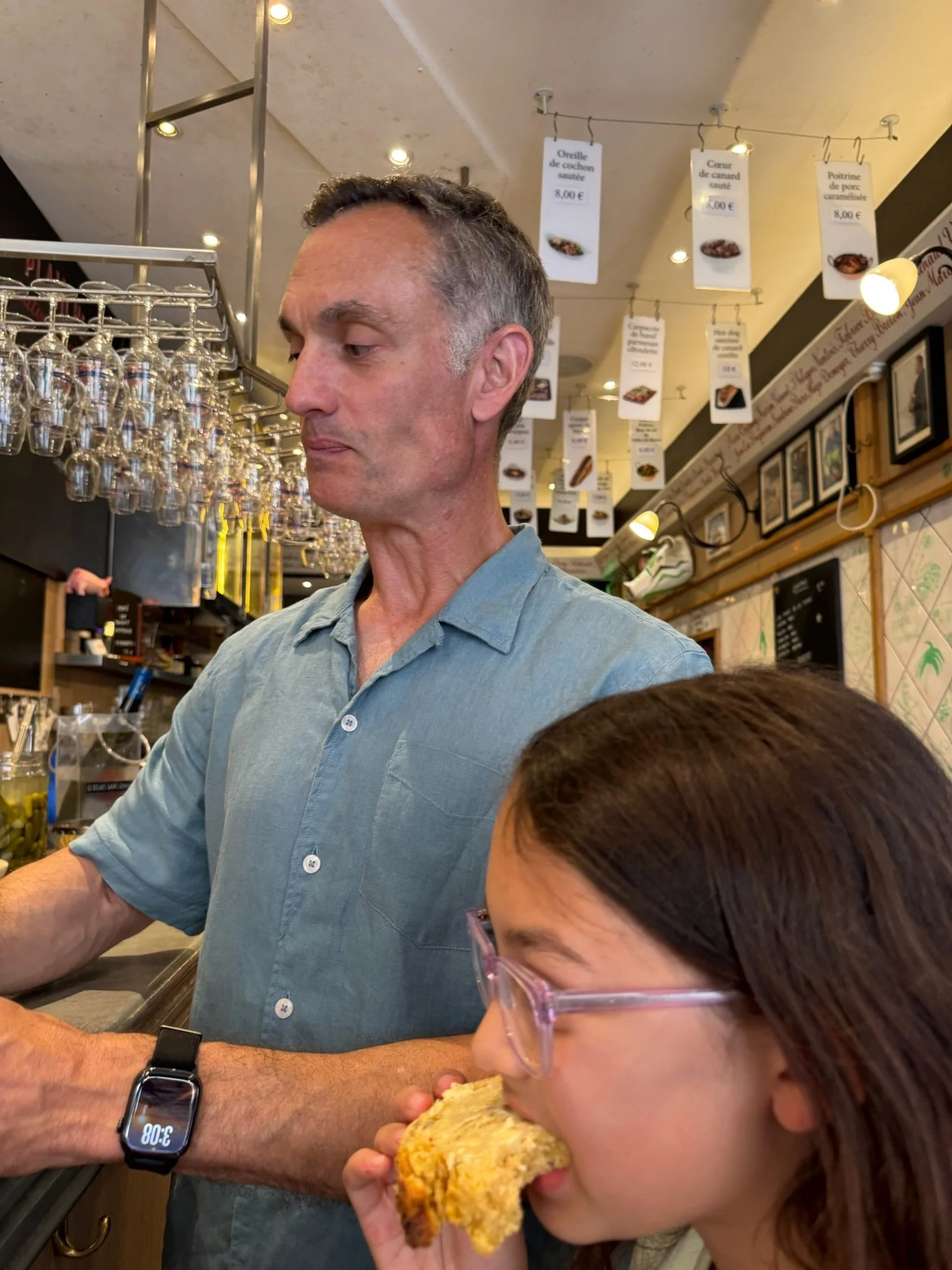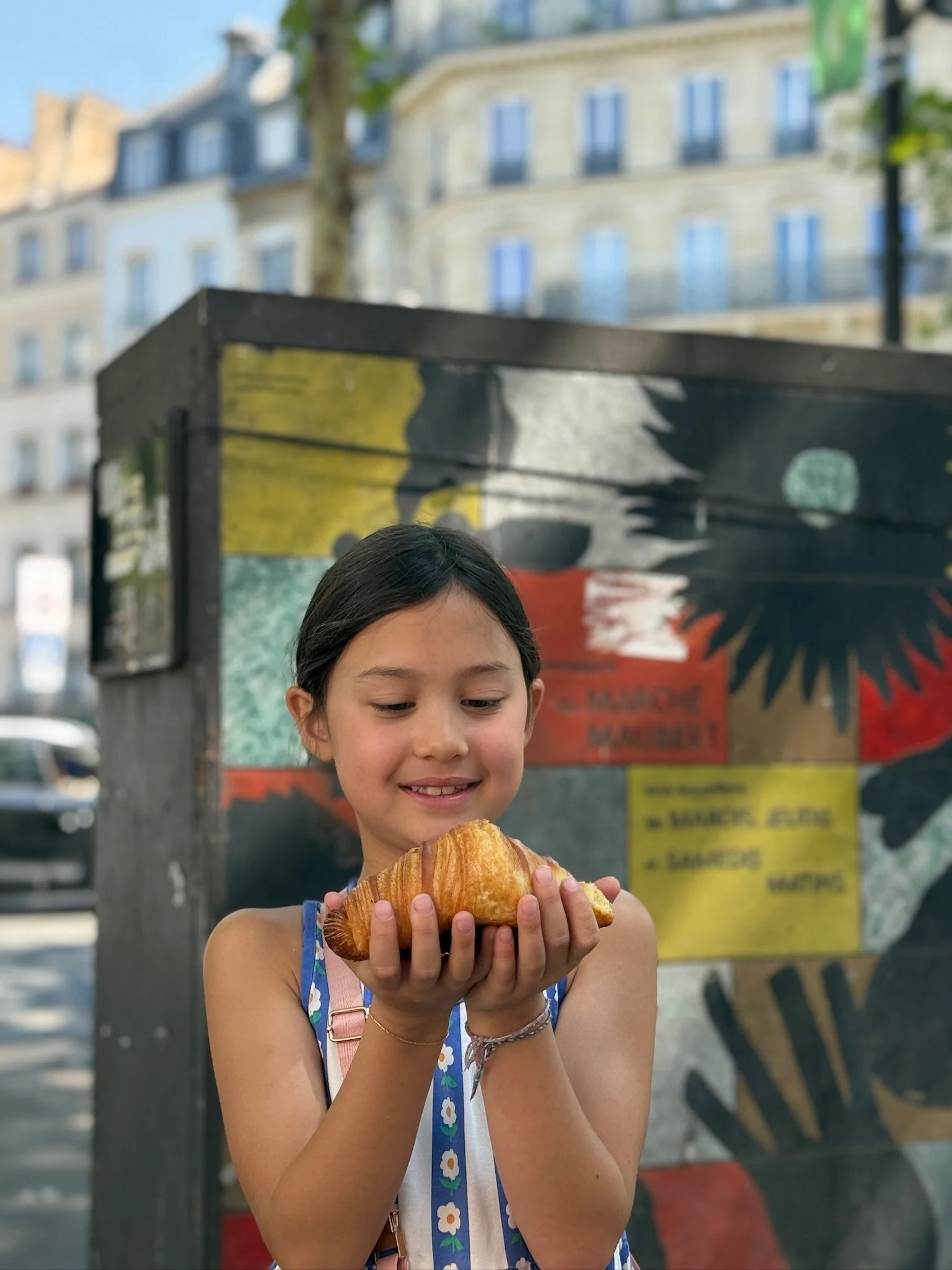 Mia eying an incroyable (that means amazing in French) croissant 🥐