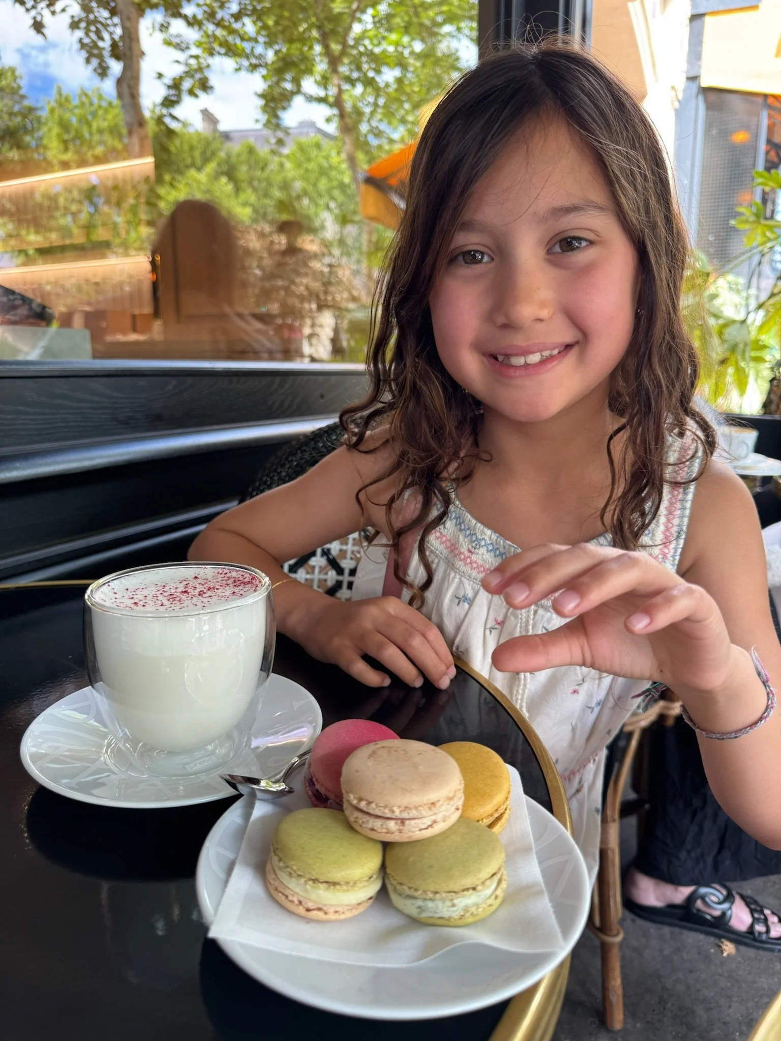 Mia reaching for the macarons at Pierre Hermé. The yummy-est one was Isfahan, and it was so yummy we had to get it 3 or 4 more times.