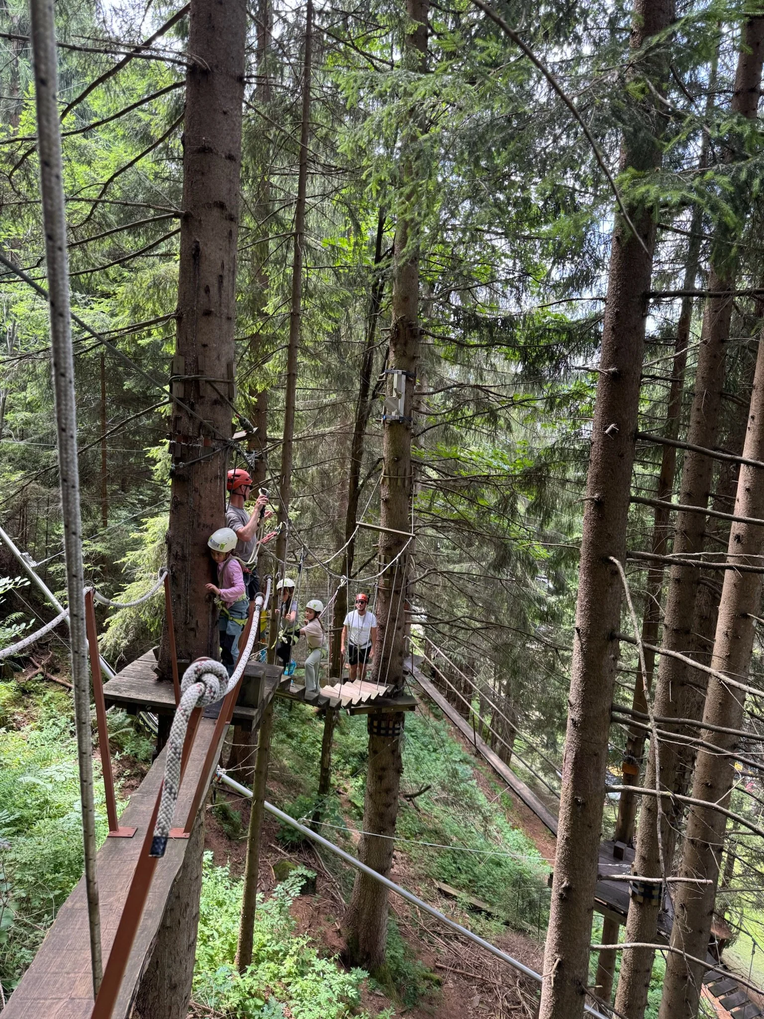 While in Ortisei, we also went to an adventure park, where we did basically parkour up in the trees. It was the best, especially at the end when we took a Fly Line down to the bottom. The Fly Line is this zipliny thing that goes through the trees, but it goes slower than a zipline. You can lean back and go backwards! My fave part was the part that swirls in a circle! Then we went into the town to grab yet another yummy lemon gelato. We then ate dinner at a fancy restaurant. My sister and the rest of our cousins ate linguini, but the adults and I had four courses of smoked eel, truffle pasta, veal cheek, and a really good apple turnover for dessert.