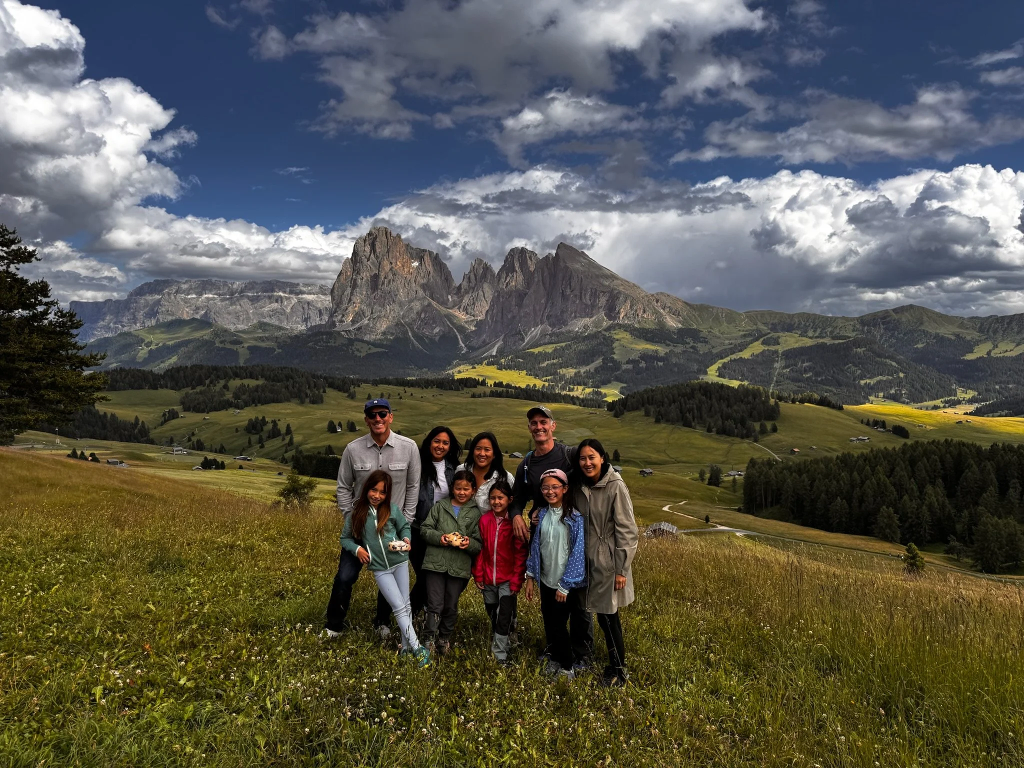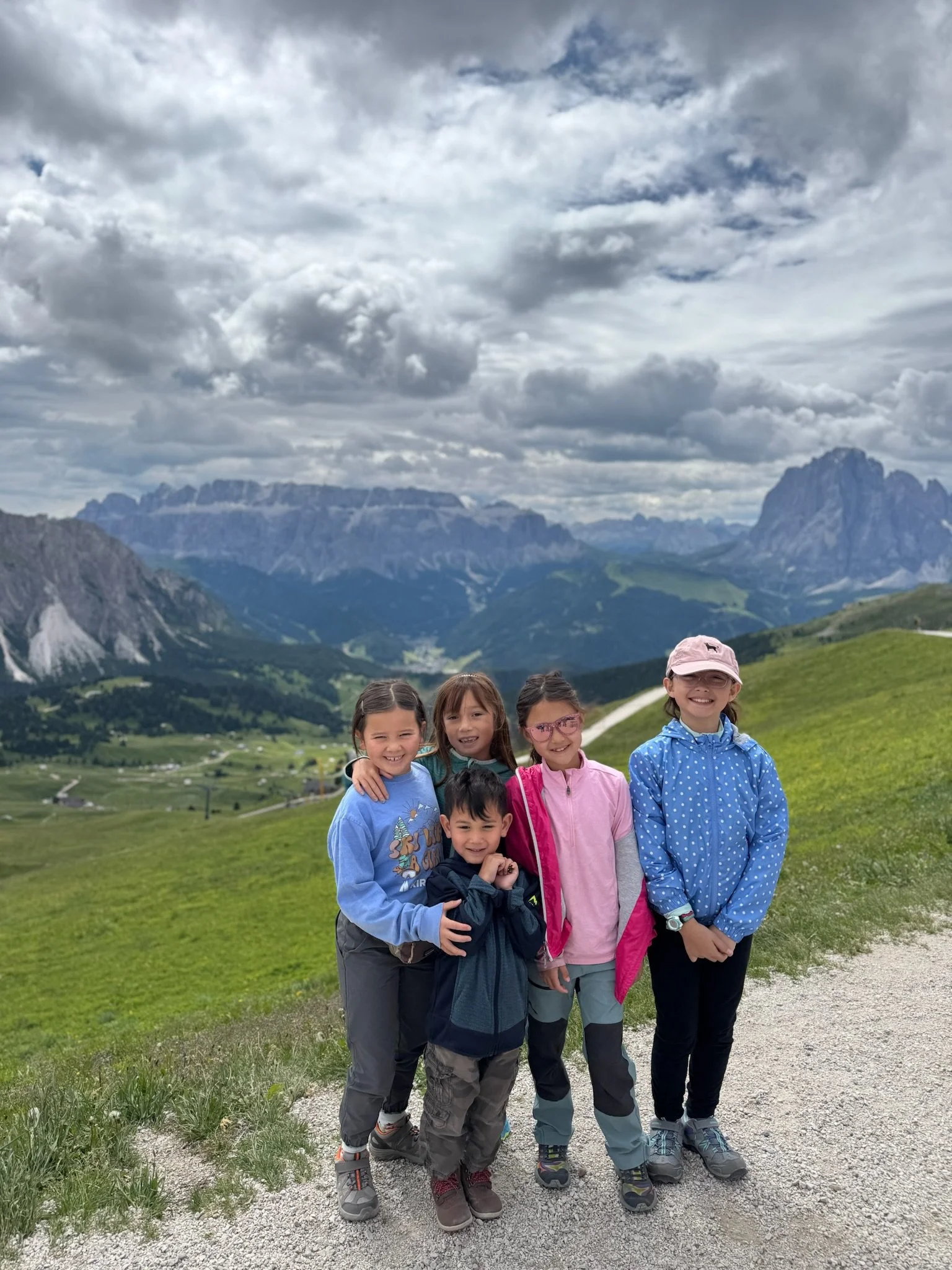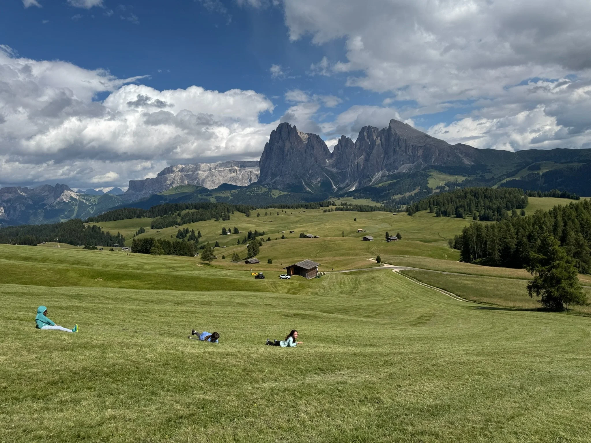 For the next two days, we went hiking around a town called Ortisei. For every single hike we took, we needed to go up the mountain partially by chairlift, and the hikes were at the top. The first hike we went to was Seceda. It was a short 10 min hike that probably took our big group of 10, 20, or 30 minutes, and then we went to Alpe di Suisi (this is the Italian name, but it has another name, Seiser Alm, which is the German name). At Alpe di Suisi, we hiked to another little refugio. While we were there, it was raining so much that it started to flood and fill people’s cups with water. After, we hiked down, frolicked for a little, and then tried rolling down the hill, but it was too itchy. We decided on just running down the hill, which was extremely scary. We took the ski chairlift back up, and even though we go skiing in Tahoe every winter, this was my first time riding one without skis or snow! When we got back to Ortisei that afternoon, we had some reaaaly delicious lemon gelato. The gelato tasted like someone had frozen some lemonade and then mashed it up into ice cream.
