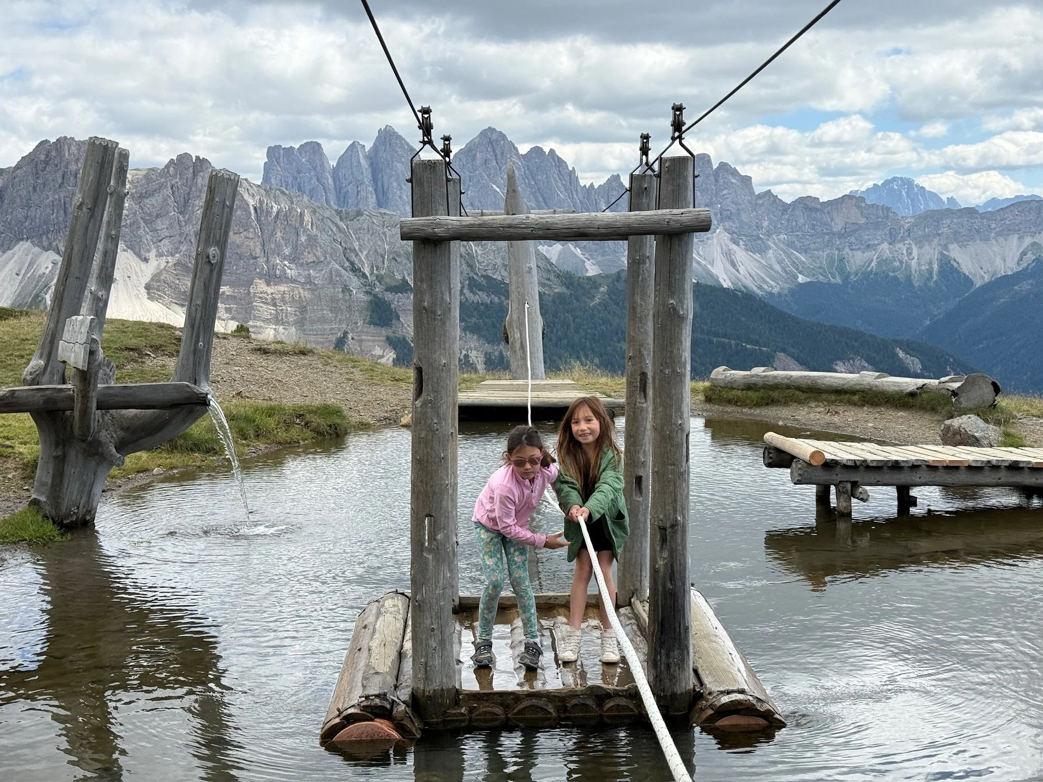 The first day we went on a hike called the Woody Walk, and there were all sorts of cool wooden playgrounds like a wooden slide, a wooden boat thing, and ball races. We ate lunch at a refugio (a refugio is like a little hotel on a mountain that usually has a restaurant, too) at the top, called Rossalm, where there were trampolines and this raft contraption where you have to pull yourself along to get to the other side. It was cool.