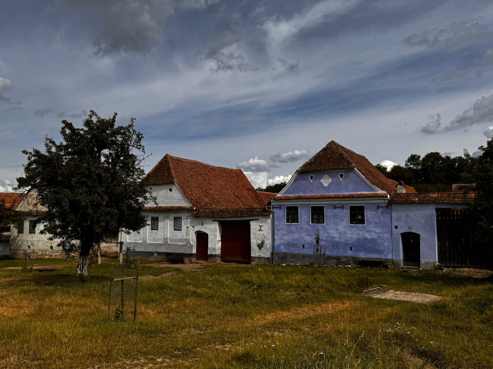 Houses in Viscri. One house is blue because, in the olden days, if you donated something to the church, you get this blue paint. So, the people with more blue houses donated more! It looks like the one next to it didn’t donate anything.