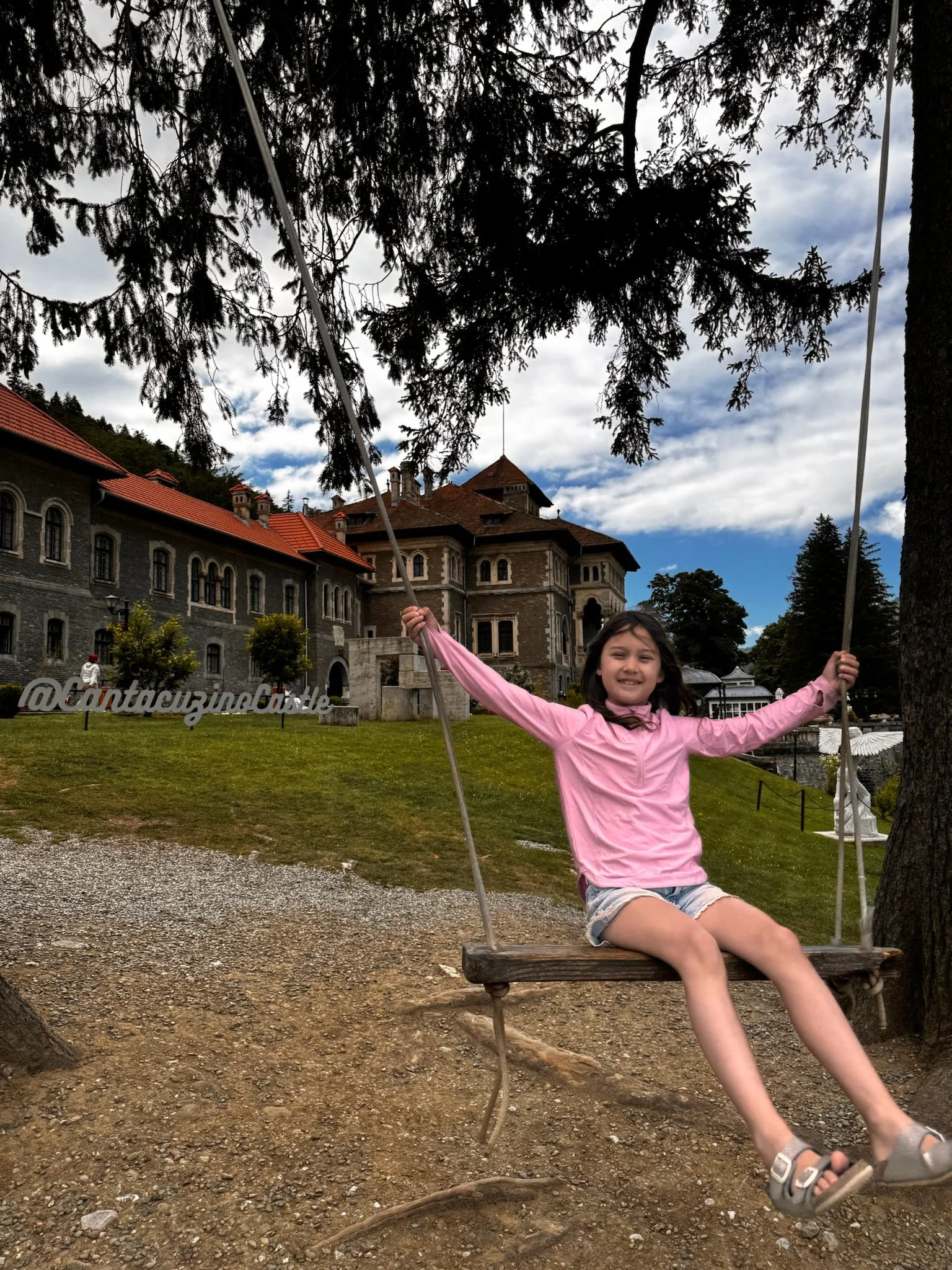Mia on a swing in front of the Wednesday castle