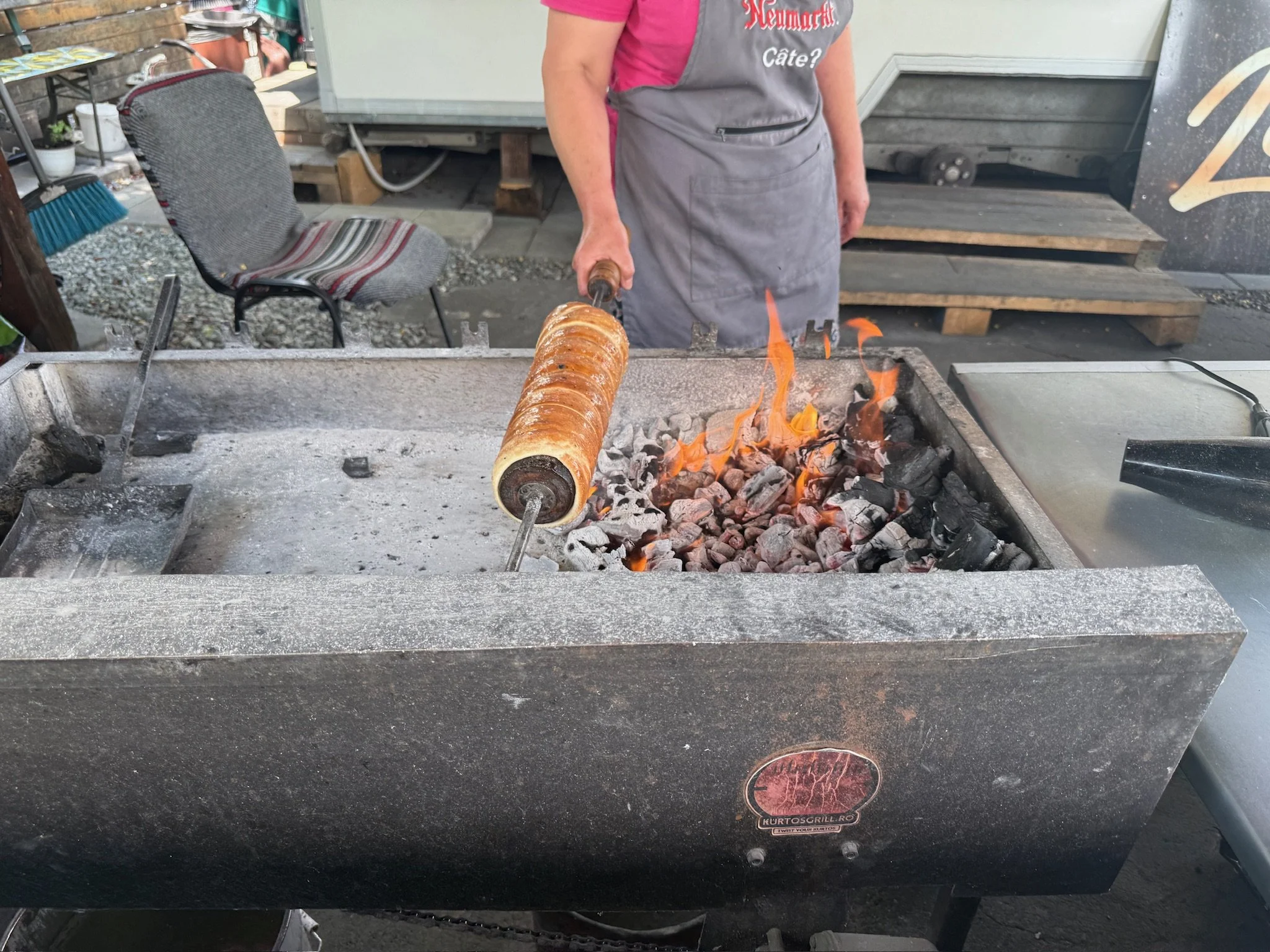 Kurtos kalacs roasting. They also used a hairdryer (on the right) to make sure it didn’t burn.