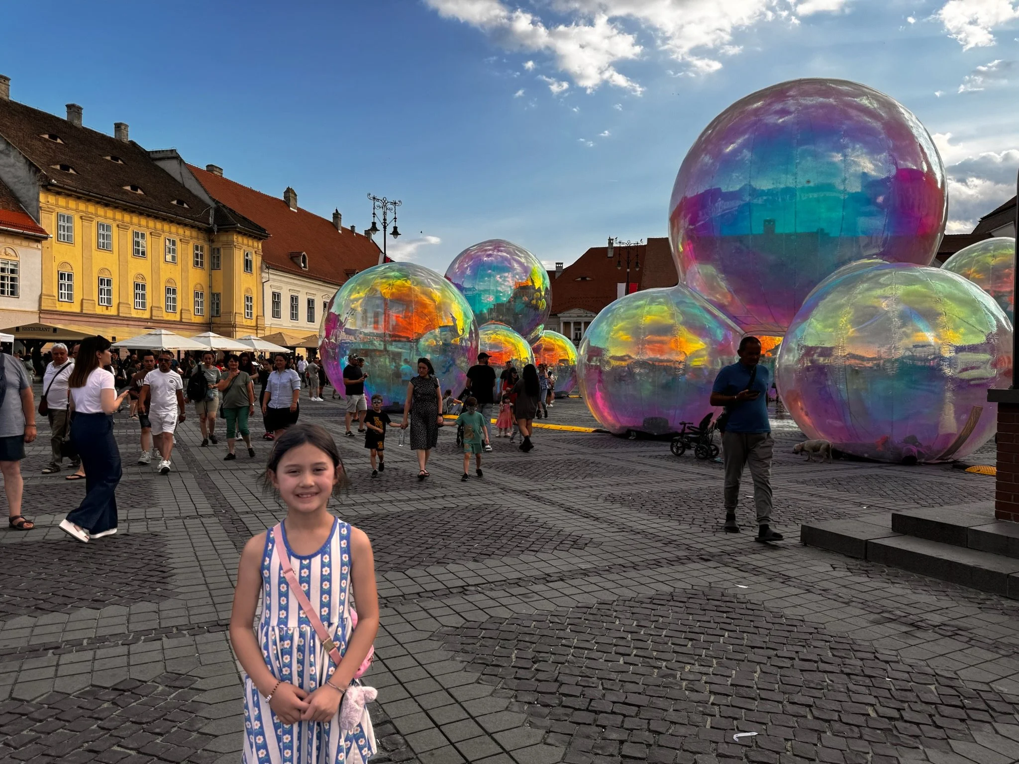 There was a music festival going on, so there was a bunch of games and stuff set up in one square, an art installation thingie that was shaped like a bunch of bubbles, and a band parading down the street. There was also a big (almost) disaster in Sibiu. My mom brought her computer, and I brought my Kindle to a cafe so I could work on my blog and my sister could read. Driving out of Sibiu, I asked for my Kindle, and she said, Where is it? At that moment, we both realized we had left the Kindle and the computer! Thankfully, we were only 5 min on our way to the next stop, so my mom ran into the restaurant to get our stuff!