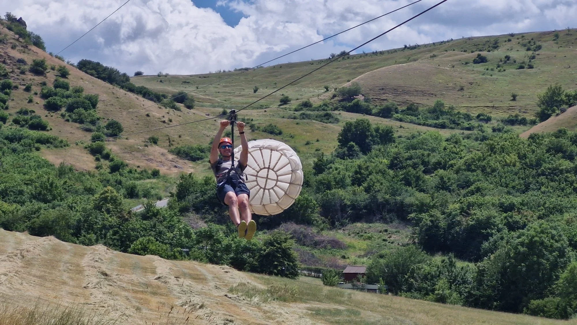 My dad ziplining with his parachute